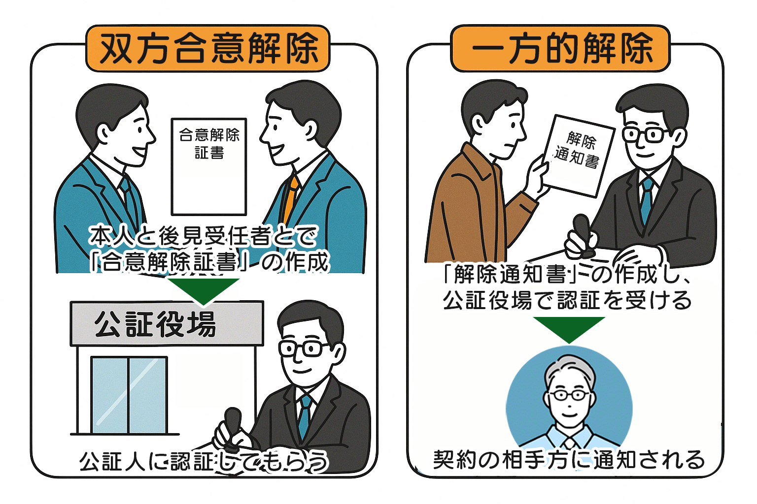 大切な契約ですので、単に「やめます」と口頭で伝え合うだけでは、法的な解除の効力は生じません。法律で定められた手続きとして、解除の意思を記載した書面について、公証役場で公証人の認証を受ける必要があります。