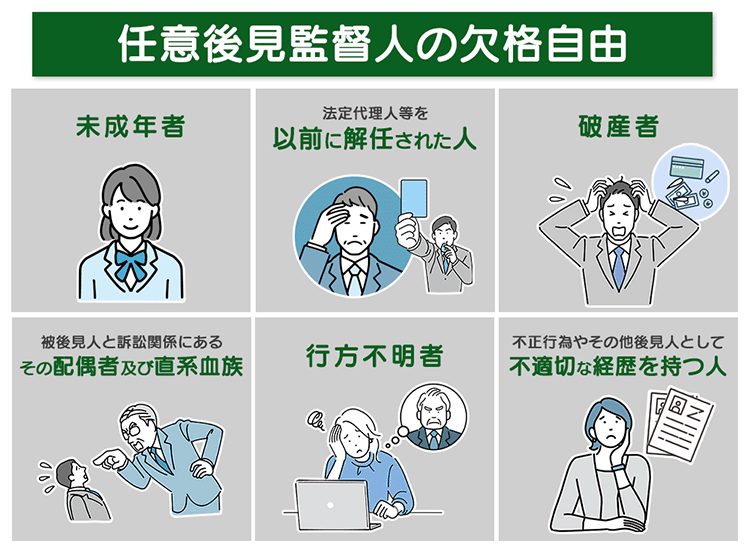 まず、任意後見監督人自身の状況や経歴によって、そもそも候補者になれないケースがあります。これを法律用語で「欠格事由(けっかくじゆう)」と呼びます。