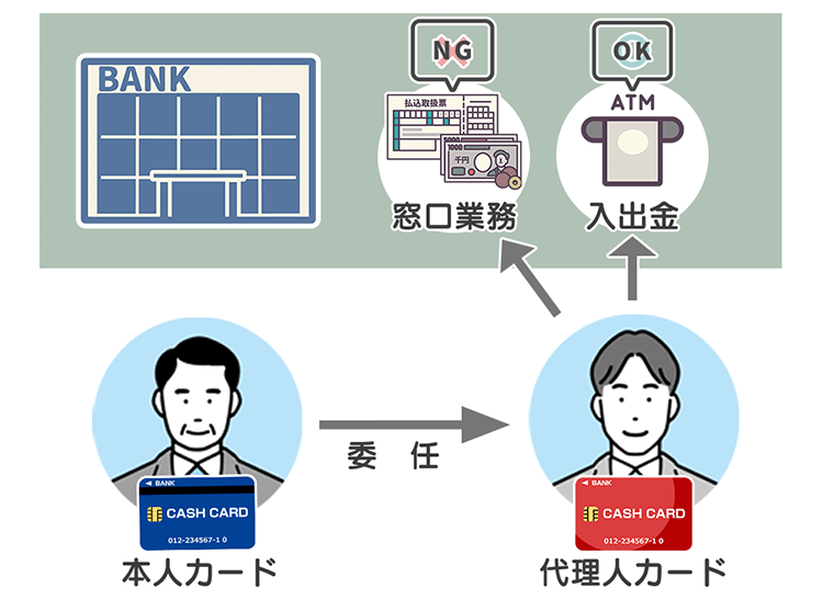 - 代理人カードは日常の入出金を代行するには便利だが、定期預金の解約など重要な取引はできない。