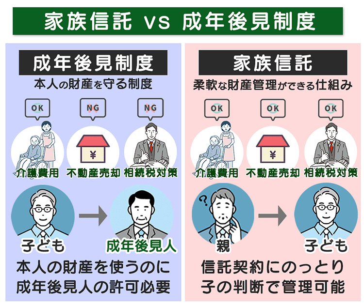 成年後見では絶対に認められない「相続税対策のための買い替え」や「孫への教育資金贈与」「アパートの大規模修繕」なども、信託契約の内容次第で自由に行えます。
