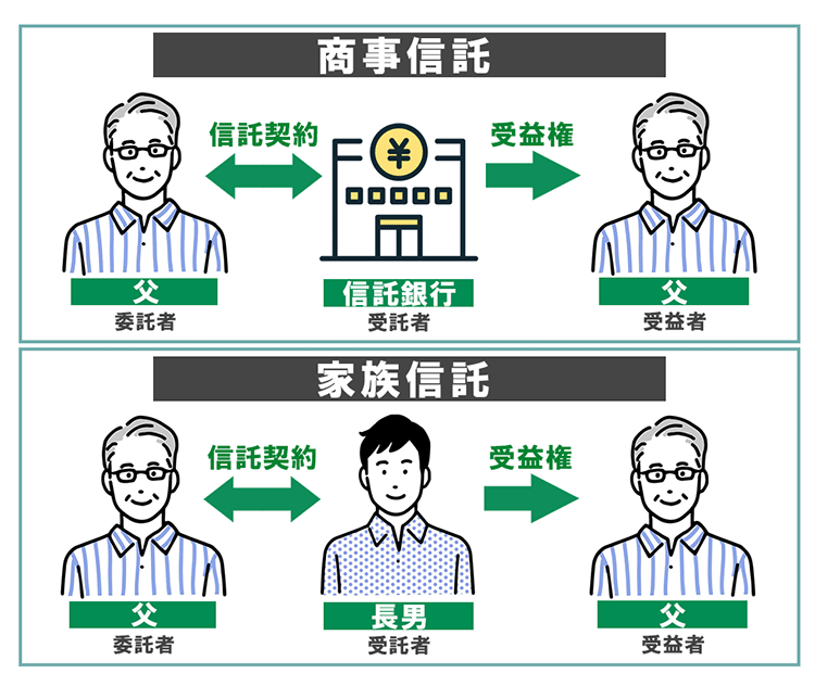 • 信託銀行のサービス(商事信託)は銀行が管理するもの、一般的な家族信託(民事信託)は家族が管理するものである。